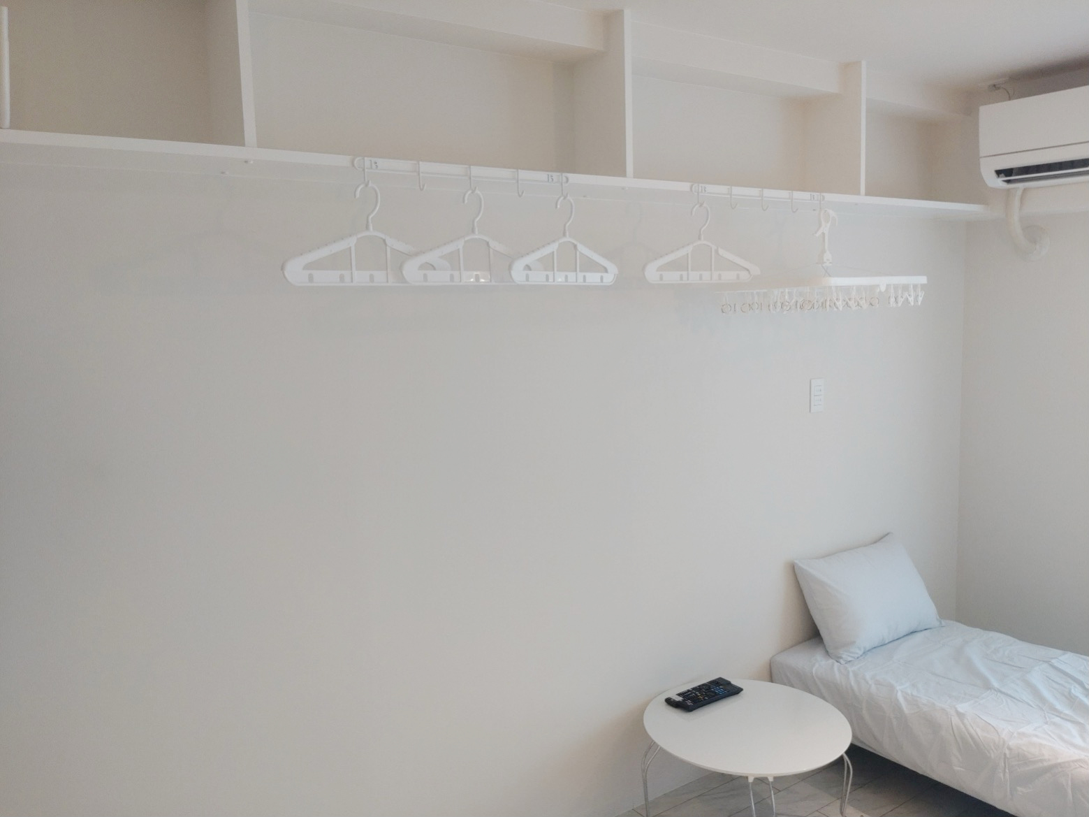 リビング&ベットルーム テレビ、DVDプレーヤー、テーブル、棚×3つ、冷暖房エアコン。