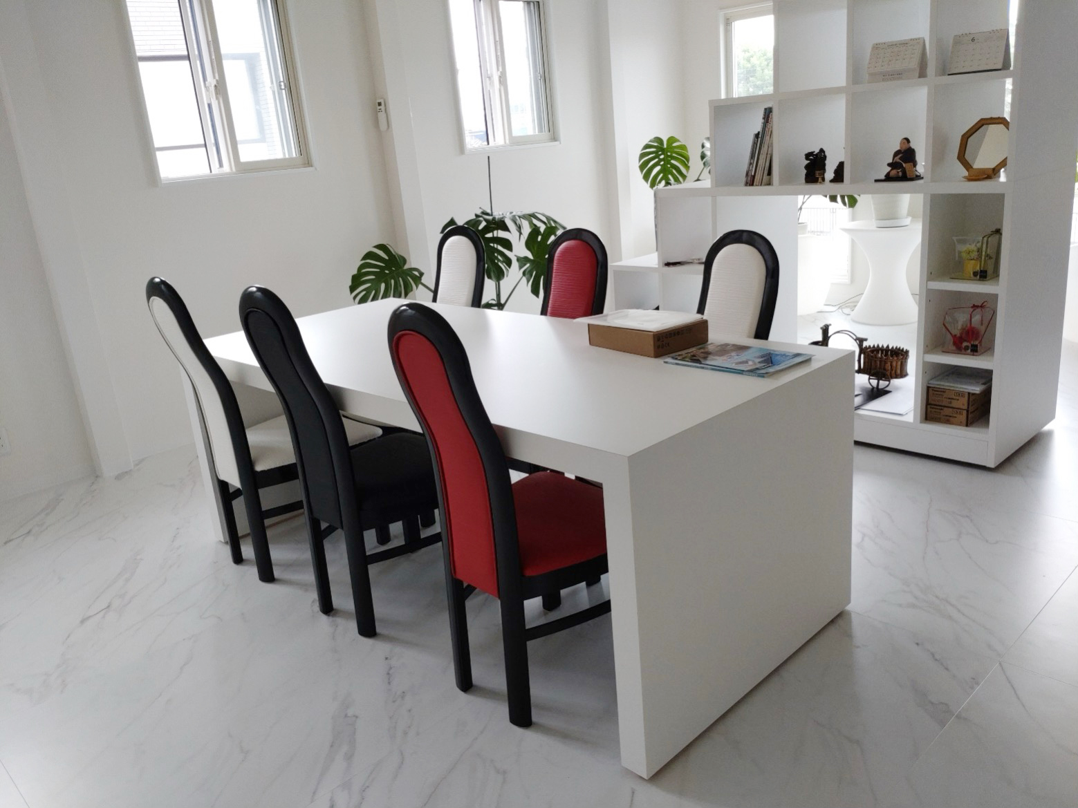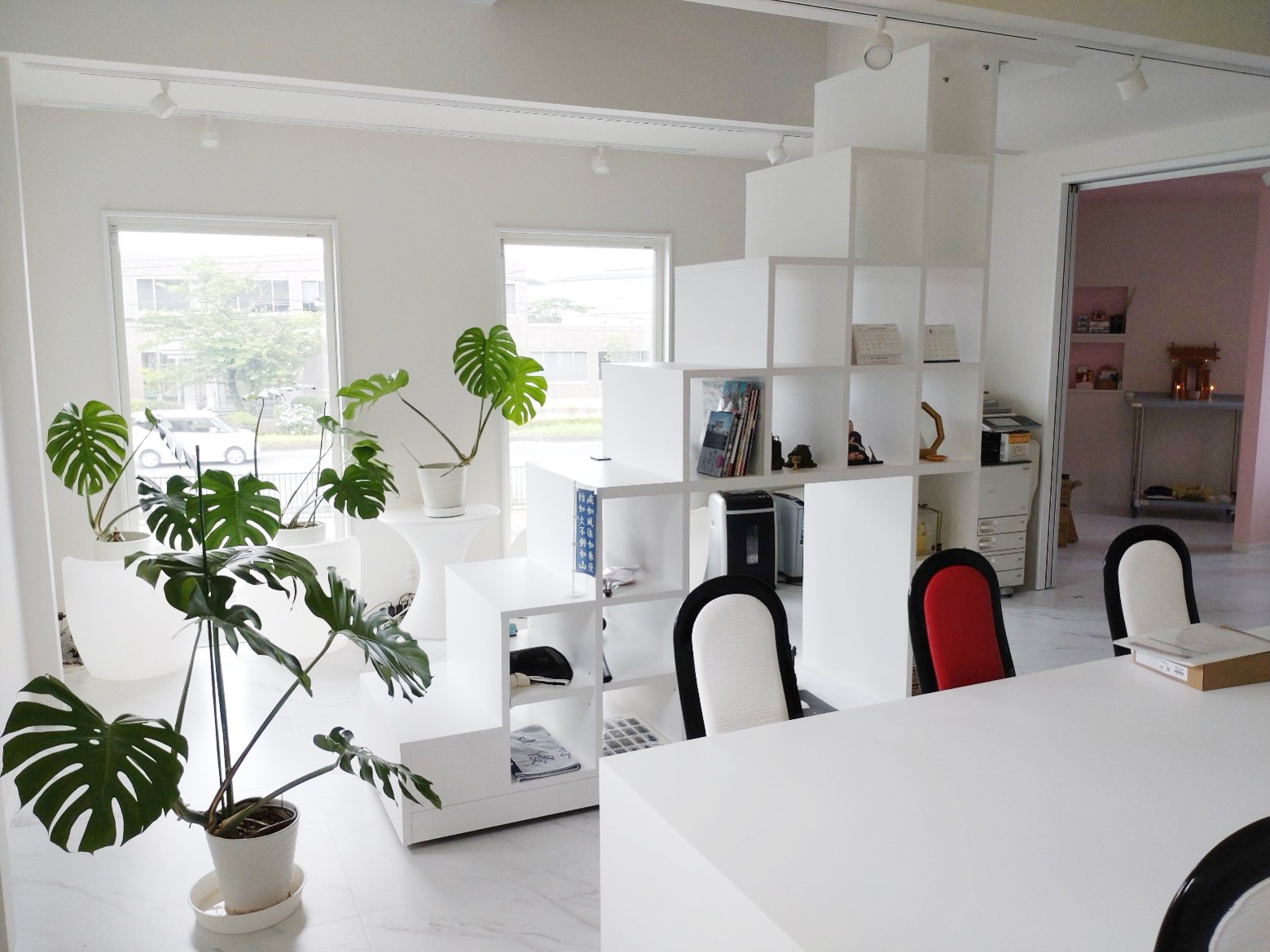 棚を階段に使用して空間を広くアレンジしたオフィス
